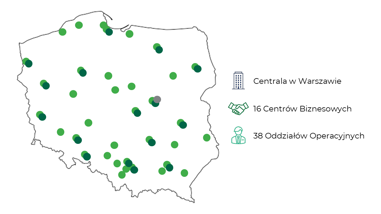 Nasi pracownicy mają szansę rozwoju zarówno w centrali naszego banku, centrum sprzedaży zdalnej, jak też w kilkunastu centrach biznesowych i kilkudziesięciu oddziałach operacyjnych na terenie całej Polski. W realizacji naszej wizji możemy liczyć na wsparcie zatrudnionych ekologów inżynierów, którzy pokazują nam, jak łączyć biznes z troską o środowisko.