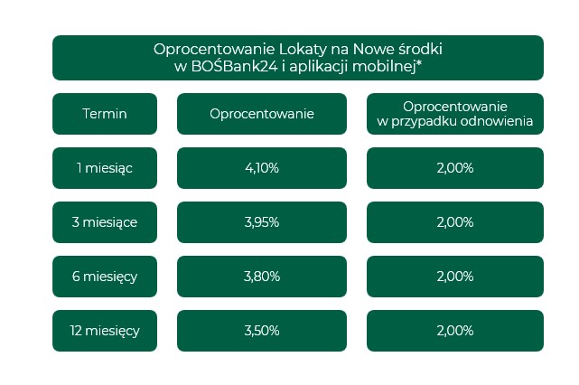 * Nowe środki to różnica między sumą pieniędzy na Twoich indywidualnych i wspólnych kontach i lokatach terminowych w PLN w BOŚ w dniu otwarcia lokaty, a sumą pieniędzy w dniu bazowym pomniejszoną o założone Lokaty na Nowe Środki w BOŚBank24. Nie uwzględniamy kont i lokat terminowych pełnomocników oraz kont i lokat terminowych w walutach innych niż PLN.